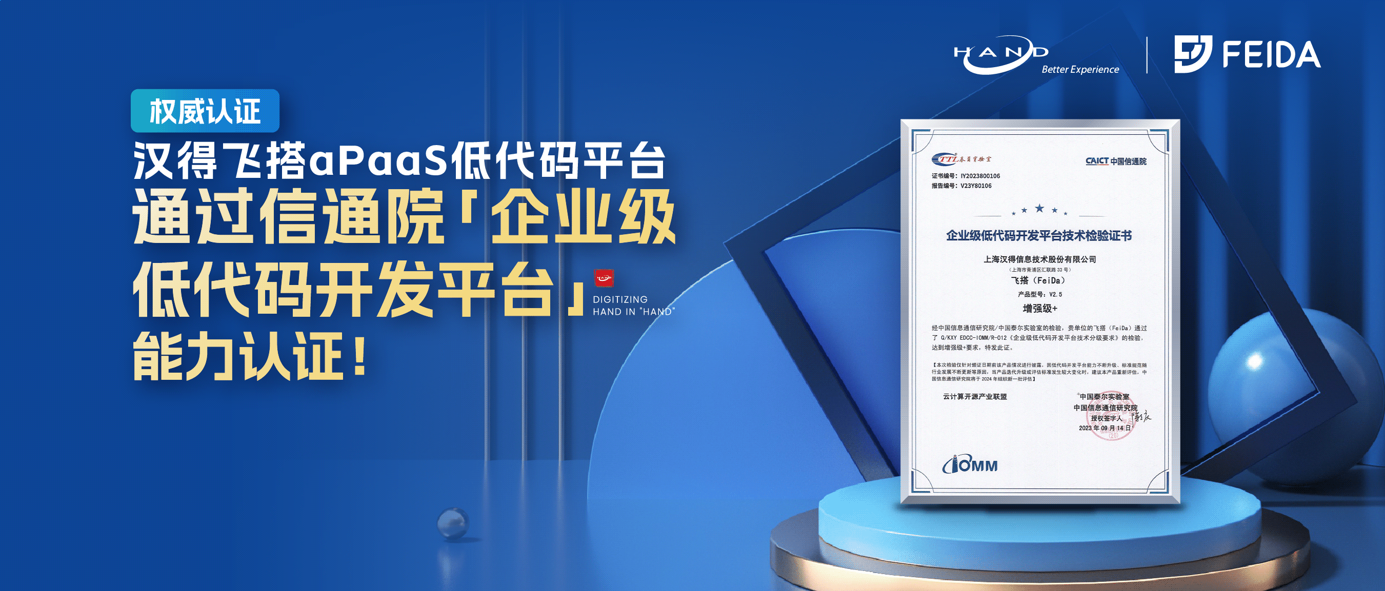 在中国信息通信研究院开展的“数字化可信服务评估体系” 专家评审中,汉得飞搭aPaaS低代码平台通过《企业级低代码开发平台技术分级要求》的检验,达到增强级+要求,可为企业提升软件开发效能,低成本、高效率应对敏捷化、多样化的市场需求,加速企业数字化转型。
