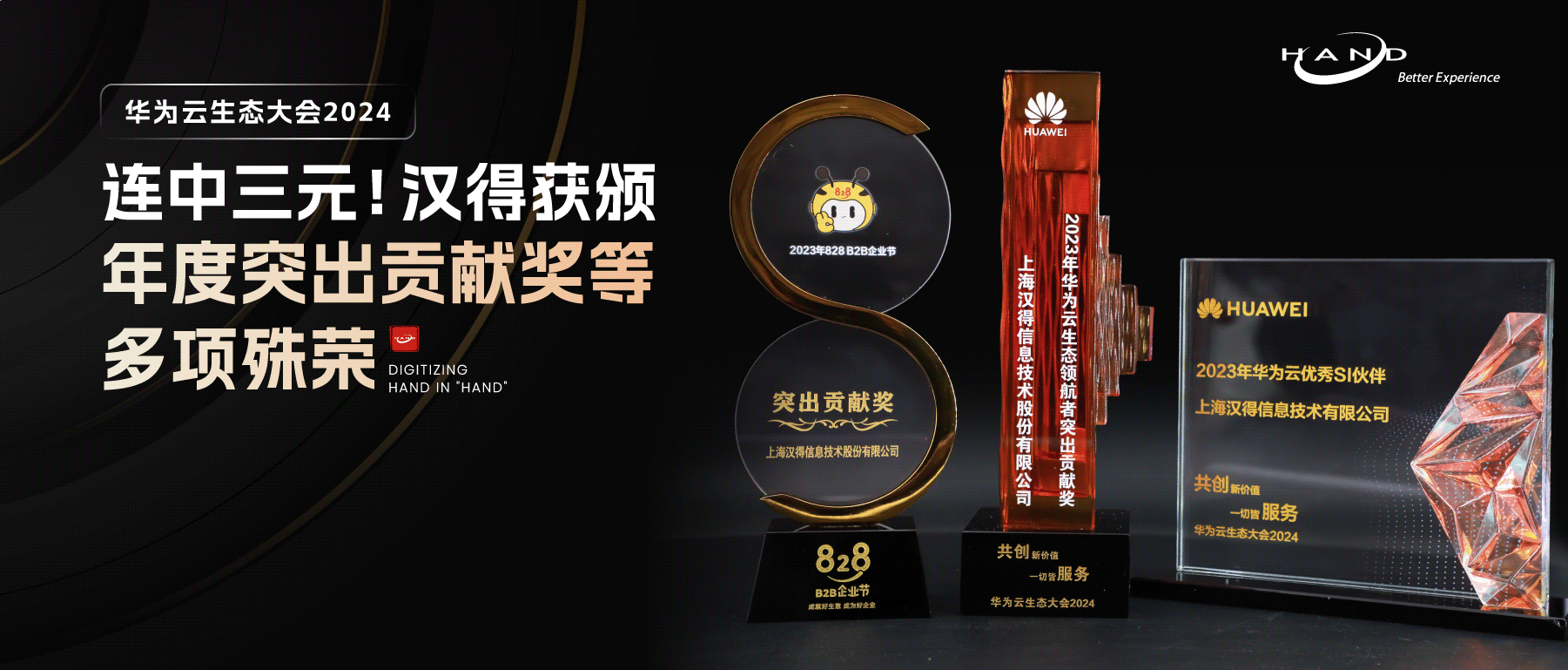 1月15日,以“领航新开局,共赢新生态”为主题的华为云生态大会2024在贵安云上屯举行,来自全国的生态伙伴与开发者齐聚,共同见证华为云生态战略的新进展,分享华为云与伙伴们的云上创新与合作成果。作为华为云生态核心合作伙伴,汉得受邀出席本次大会,并获颁“2023年华为云生态领航者突出贡献奖”、“2023年828 B2B 企业节突出贡献奖”、“2023年华为云优秀SI伙伴”等多项年度殊荣。