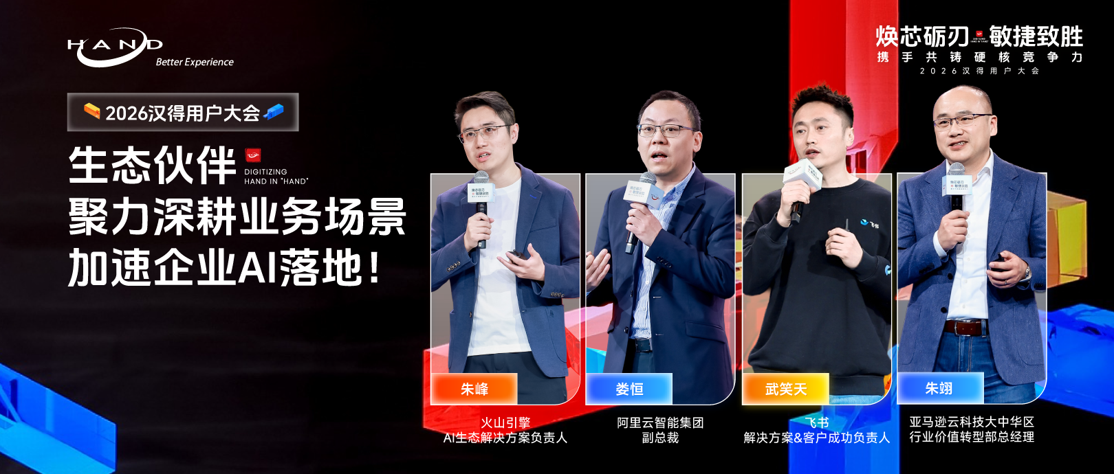 2026汉得用户大会现场,来自火山引擎、阿里云、飞书、亚马逊云科技等全球领先科技生态伙伴,也分别从各自的专业领域出发,深入探讨 AI 如何重塑企业级应用范式,以及与汉得携手打造的 AI 联合解决方案。