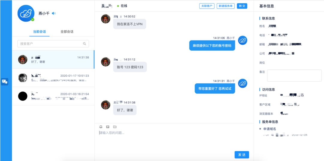 同时,燕千云提供在线客服的即时通讯方式,告别电话和邮件,解决远程通讯不便的麻烦。