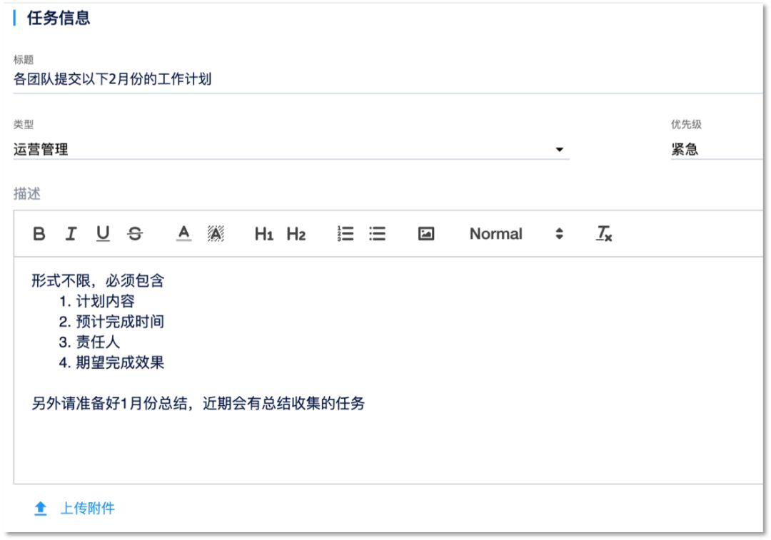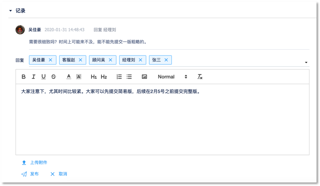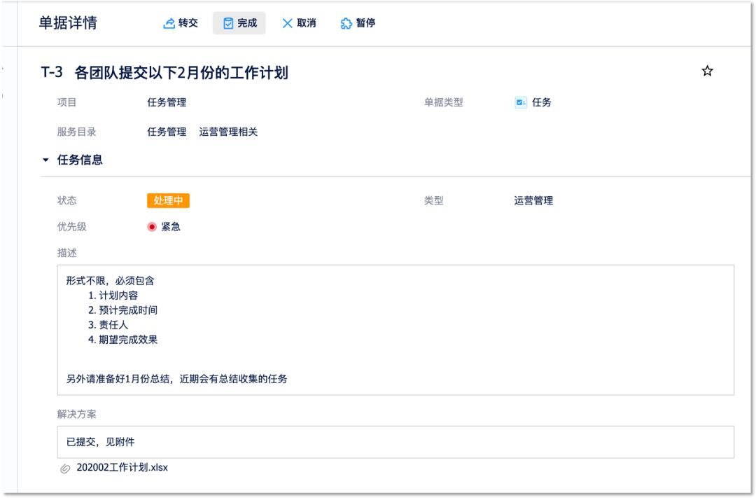 基于任务单进行交流沟通、状态记录、转派、附件提交等操作。