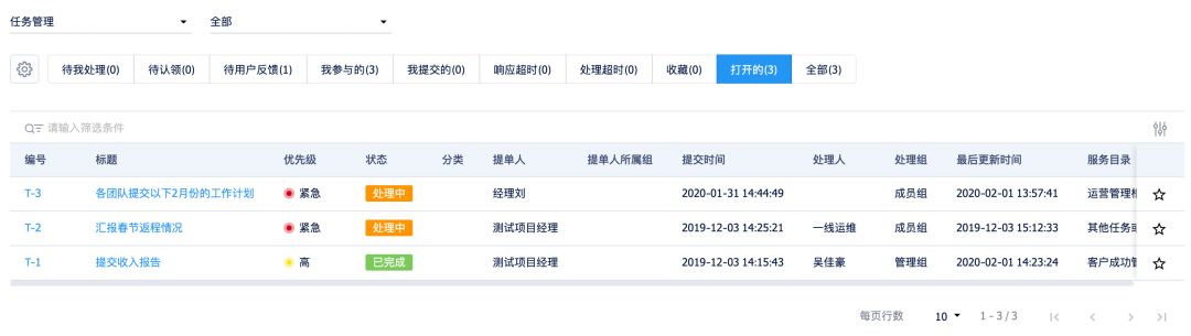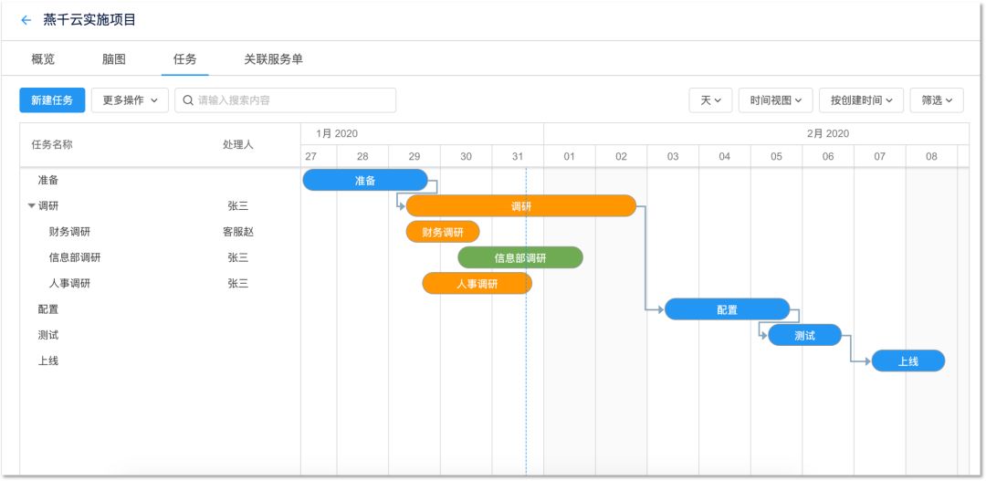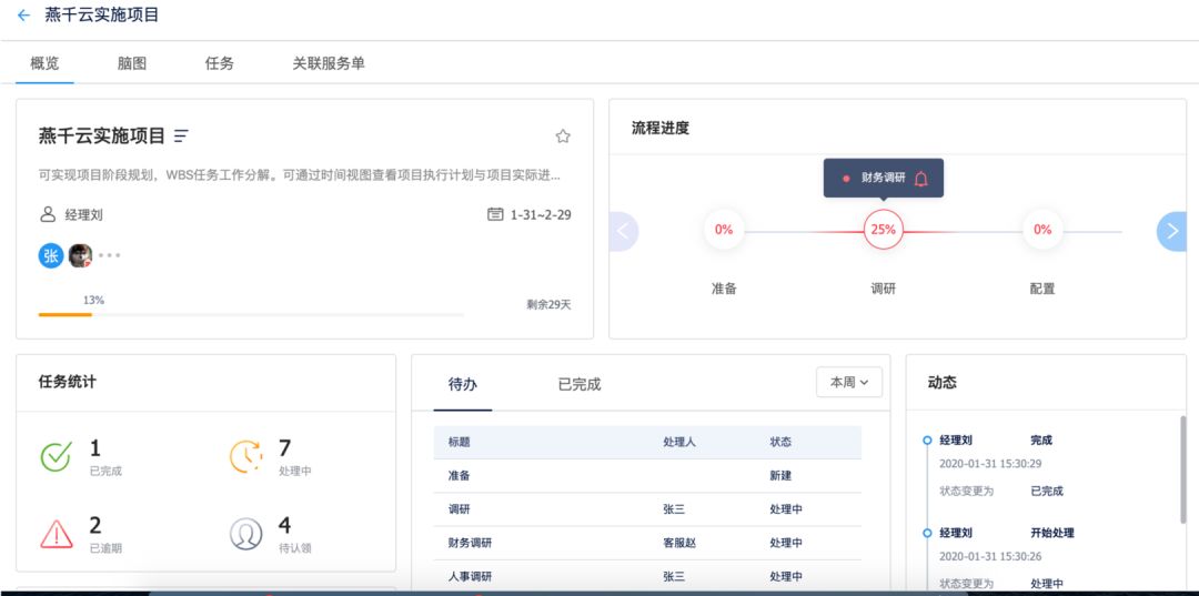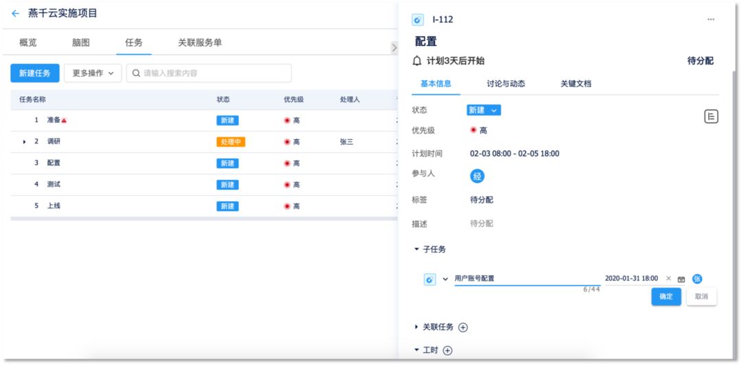 燕千云提供任务管理标准模版,可以帮您快速创建任务单并指派给相应的负责人或团队。如果有个性化的字段或流程需求,也可以进行灵活调整。