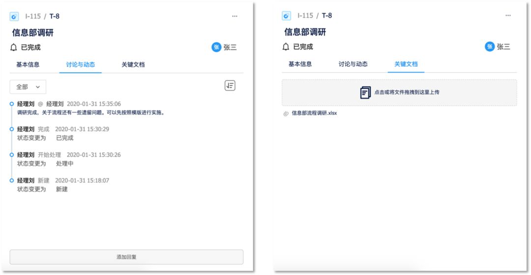 工作进度反馈,基于工作任务进行交流讨论,更新任务状态,上传关键文档、材料。