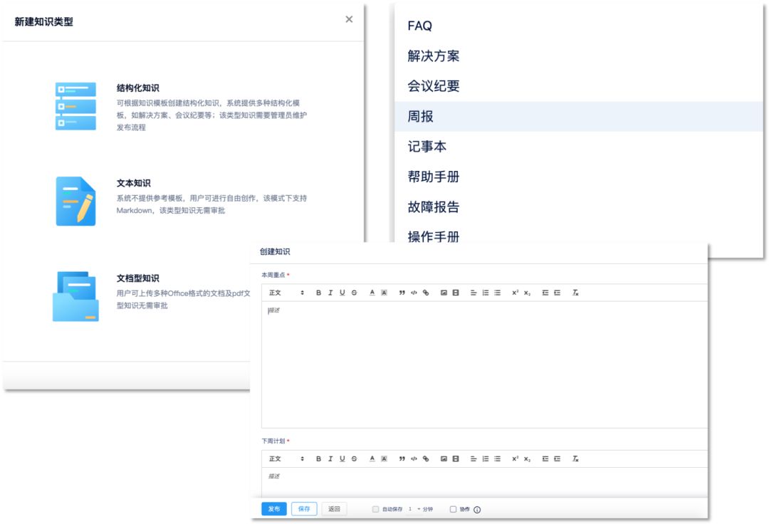 提供多种模版,包括会议纪要、周报、月报、记事本、帮助手册等,用户也可以自定义自己的知识模版
