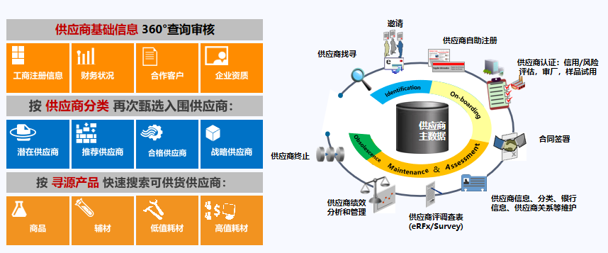 闭环可视化的供应商生命周期管理体系,可帮助集团实现从供应商注册、资质评审、绩效考核至供应商资料管理全程可视化,助力构建集团统一的采购平台,使采购过程数据真实完整,采购业务阳光透明、可追溯。