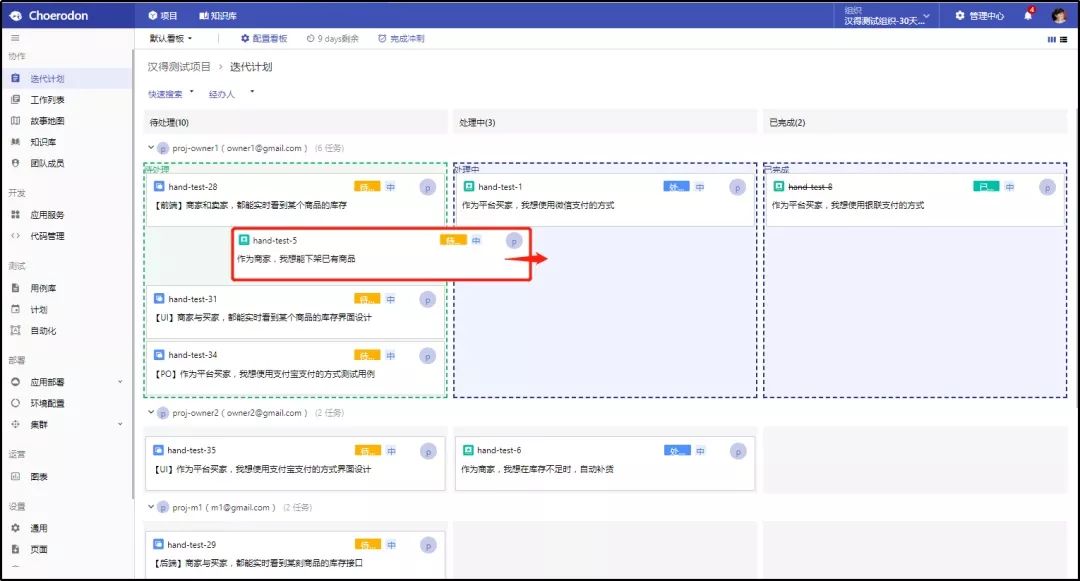 在评审会开始之前,开发团队会检查 Choerodon 敏捷管理活跃冲刺看板中的故事完成情况,根据完成任务后的测试情况,拖动卡片到看板已完成的列,整理未完成的任务。