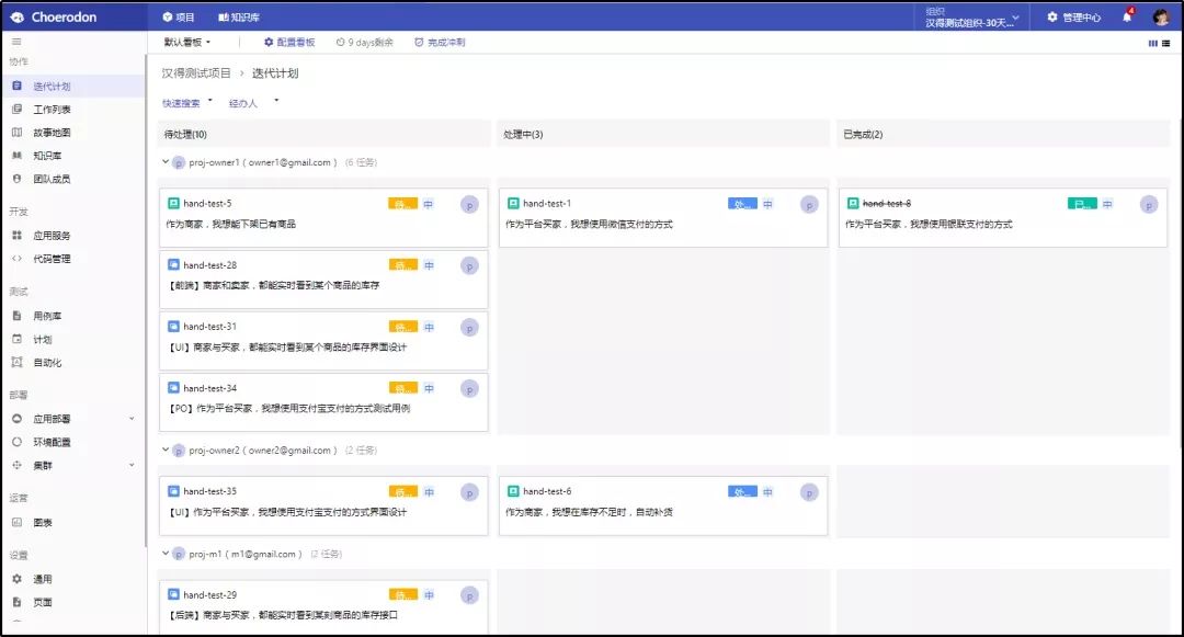 Choerodon 敏捷管理中的迭代计划看板可用于进行开发迭代任务可视化管理,每个任务下的子任务、经办人、任务状态、任务类型都在看板中显示,每一个开发人员都可以看到团队开发的流程进度。