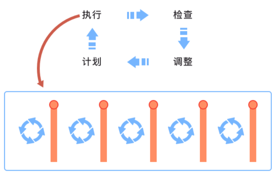 为了解决这一问题,SAFe提供两个同步的PDCA环,团队的PDCA循环是同步的,所有的团队在同一时间开始迭代,也在同一时间结束迭代。团队的循环包含在PI的循环里面。