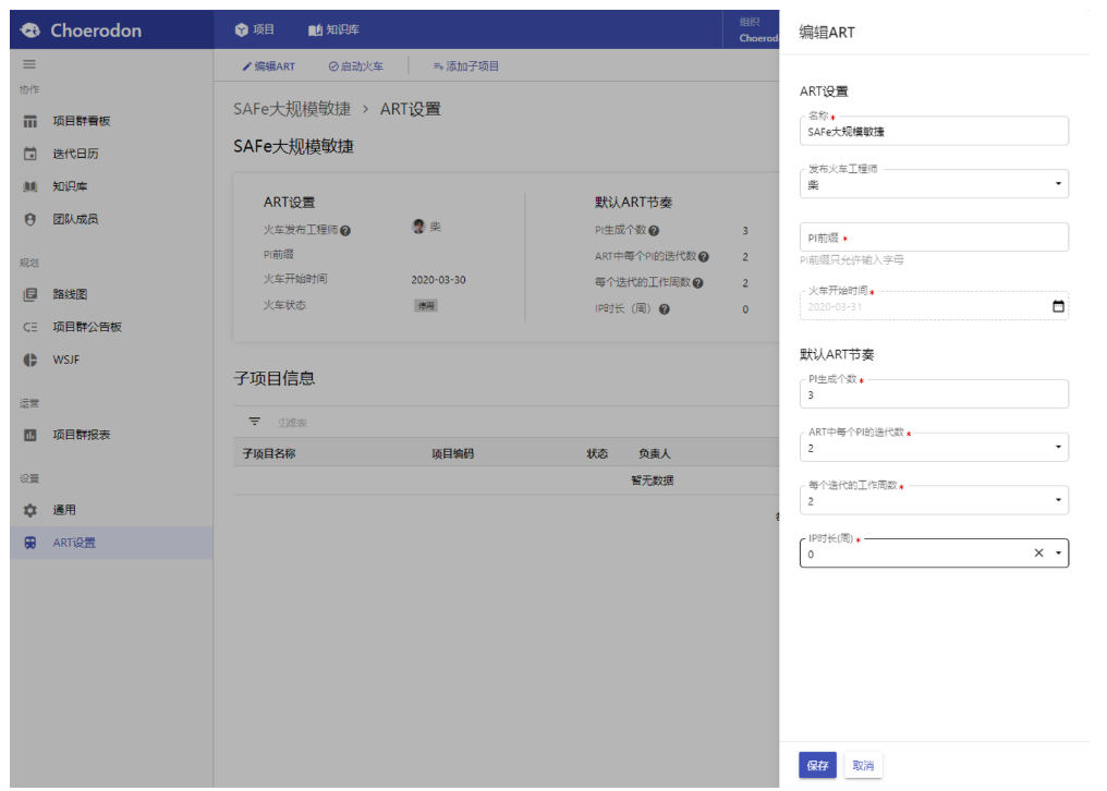 启动ART必须确定迭代节奏,它是由迭代长度(默认2周)和PI长度(默认包含两个迭代,以及IP迭代)组成。PI开启后,子项目会自动按照这里的默认节奏创建冲刺。
