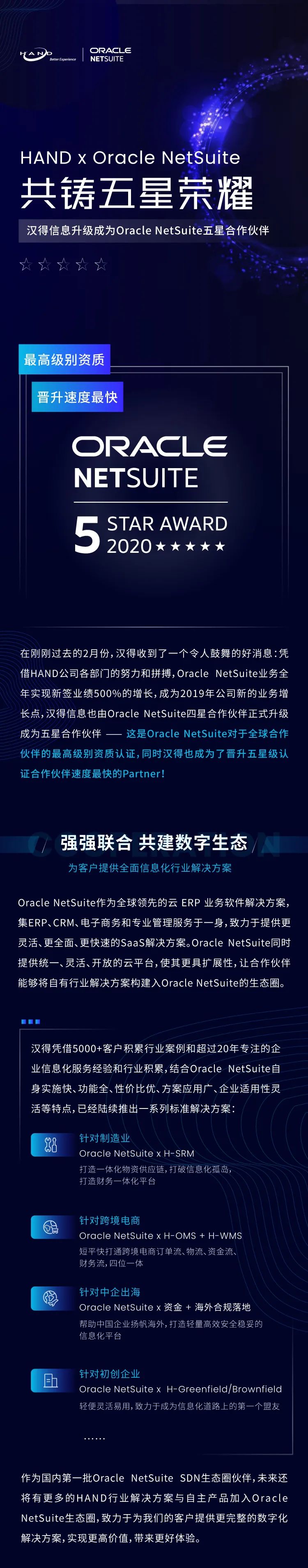 汉得升级成为Oracle NetSuite 全球合作伙伴最高级别五星资质认证的Partner,同时汉得也成为了晋升五星级认证合作伙伴速度最快的Partner!