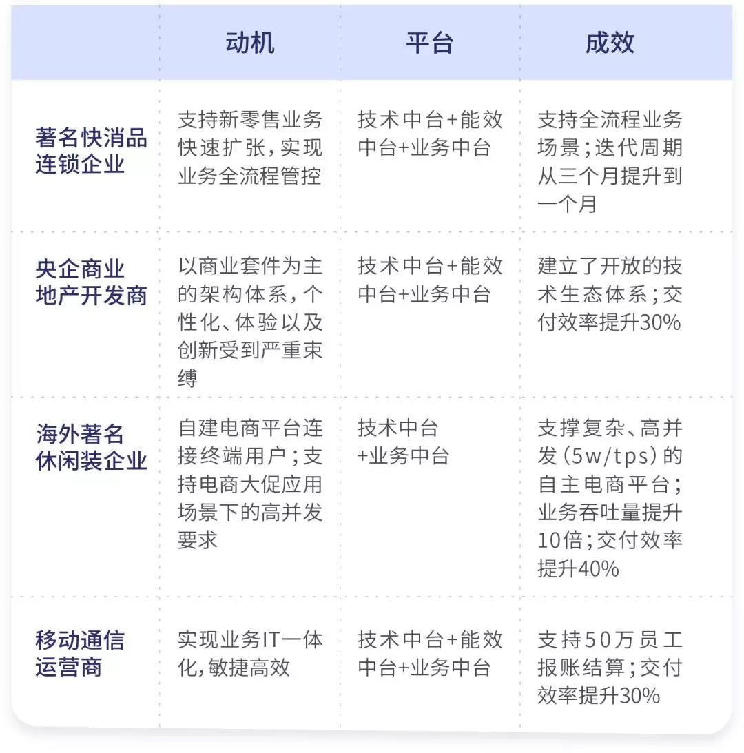 场景丰富的业务中台 前言: 在企业数字化转型的过程中,如何更快速地响应变幻莫测的市场、更好地利用迭代更新的技术、最大价值地发挥企业现存多年的信息化建设基础,真正做到降本增效,是每个企业都需要思考的问题。 汉得成立二十多年以来,我们为数千家国内外中大型企业提供了咨询服务及信息化建设服务,也见证了企业信息化建设的变革及创新历程。汉得融合中台致力于打造企业级数字化平台,包括技术中台、能效中台、业务中台。 其中,业务中台 HONE 不是单纯的信息化工具与手段,更是一种能力——它整合了企业核心竞争力,沉淀了业务逻辑,并保持不断运营,服务于企业内各部门、各业态,乃至服务于上下游、服务于整个社会。 业务中台 HONE 依托于技术中台 HZERO,以微服务方式,按不同业务域整合业务能力,服务前端应用,以实现能力复用,减少重复构建。 结合多年企业咨询服务经验,提炼数十种企业级服务能力,覆盖从财务、营销、制造到供应链等全业务场景,可供各行业快速部署和复用。 财务 包括会计引擎、预算控制、拆单引擎、信用引擎、计税引擎、对账引擎、派工引擎、银企服务、销项开票、进项抵扣、核销引擎、绩效引擎、财务主数据中心等。 多种财务核算的通用业务组件,可供企业按需组合使用,释放了企业在事务记账与核算管理的资源投入,更聚焦于财务分析,创建共享财务。 营销 包括商品中心、会员中心、促销券、活动中心、CPQ报价、VPC选配等。 营销业务中台为前端应用提供了统一的营销数据管理与业务积累,有营销业务中台作为坚实的服务基础,企业可以更专注于与前端用户的交互、市场变化趋势,开展创新营销、智慧营销。 制造 包括安全库存检查、工单中心等。核心业务能力服务化,可以更快速地适应技术革新,用更低的成本、更沉稳的姿态拥抱智能制造。 供应链 包括各数据项生命周期引擎、库存中心、竞价引擎等。将产品价值链与供应链的各环节更加紧密连接、高效协同,降低成本,提高整体能效。 其他 包括考评引擎、合同中心、空间管理、人力中心等,业务组件覆盖面广,在提供稳定服务的同时,我们也持续拓展,不断丰富和提升能力中心。 目前,汉得已为多家中大型企业提供中台服务,以下为简单分享的几个案例: 在这几个案例中,行业性质虽各不相同,但通过汉得中台的实施,在短期内均取得了可见的效益,我们也相信,随着中台的持续建设以及客户业务能力的持续积累,中台所带来的价值也将持续输出。 这也是汉得融合中台解决方案与其他服务厂商的差别所在,汉得融合中台解决方案覆盖的业务场景更加丰富、行业更加广泛,不局限于某一类或某几类特定行业,之所以能做到这一点,也源于汉得二十多年来在企业信息化咨询服务行业的不断累积。 同时,与传统ERP实施不同的是,瀑布式实施方法论在中台实施中有其局限性,汉得也探寻和形成了一套更适用于中台实施的方法论,通过领域驱动设计,基于实践的敏捷管理和DevOps方法,用更加科学合理的方法,开始中台建设,也让企业具备持续建设中台的能力。 业务中台打造的是企业核心竞争力服务平台,是企业持续发展的业务能力沉淀,汉得业务中台一方面结合了多年的企业级咨询服务经验,另一方面,也融合了汉得技术中台、能效中台,具备灵活、高可用及可持续发展等特点。 我们期望通过汉得业务中台,助力企业数字化转型,同时我们也更加期待,随着更多能力与服务的构建、开放、整合,随着共享经济的到来,汉得可以携手客户伙伴们,共同打造良好的生态体系,贡献于融合创新、跨界创新。 汉得融合中台全景介绍 详见本期季刊更多内容