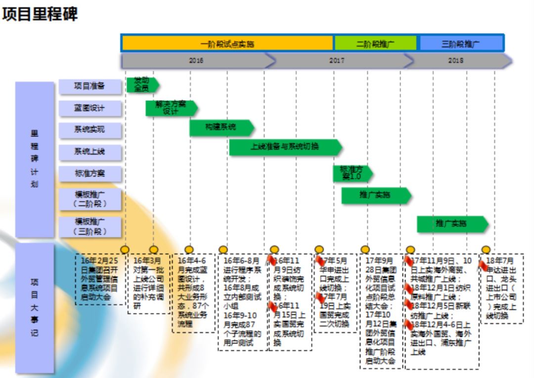 项目自2016年2月25日启动,历经一阶段试点、二阶段推广、三阶段推广(上市公司),2018年7月初完成东方国际集团下原上海纺织下属外贸板块公司的实施工作。