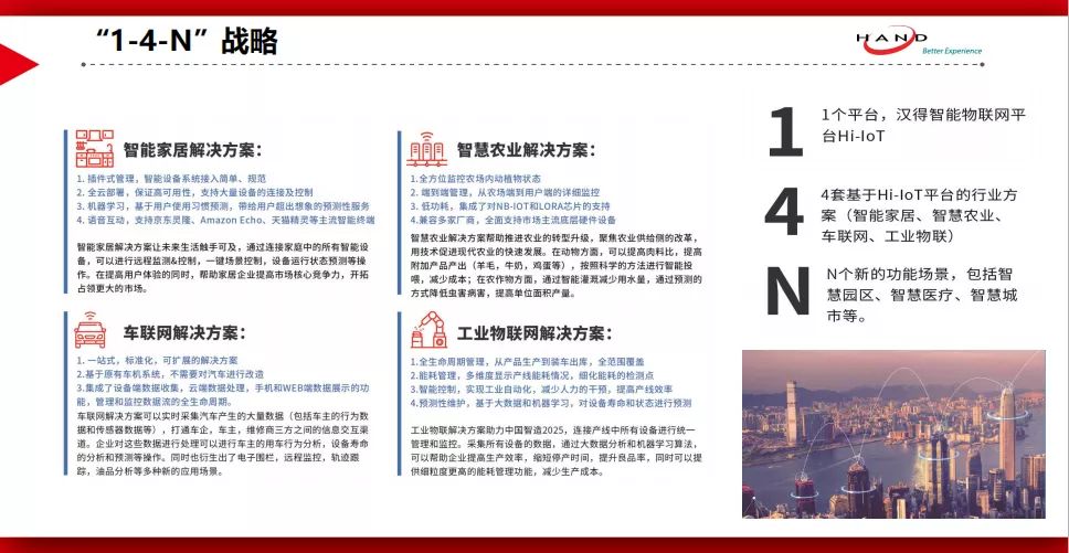 目前,汉得物联网&云事业部在深入发展IoT创新技术的同时,在智慧农业、工业物联网、车联网、智能家居这四个领域形成了成熟的解决方案,并已推出创新型产品:SaaS物联网平台(Hi-IoT)、汉得智慧畜牧管理软件(Hi-Herd)。