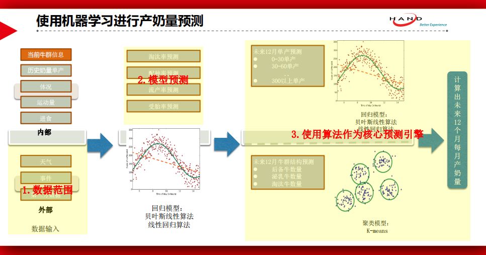 在智慧农业案例中,汉得物联网&云事业部利用机器学习的算法构建牛群预测、奶量预测,对未来进行洞察;将料、药、奶、车、质检验收、质量分析全链路打通,形成原奶质量的全链路追溯,实现质量全流程管理。
