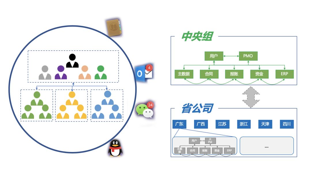 ERP项目作为集中化核心项目,横向与多个系统平台对接,纵向涉及中央组、推广组、省端外围厂商间的合作协调,同时在推广过程中,各省实际业务流程与管理需求差异大,对项目管理与方案落地都提出了巨大的挑战。