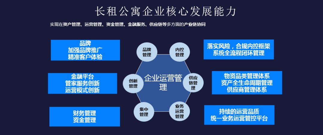 基于汉得多年来在该领域积累的行业经验与探索研究发现,长租公寓企业在品牌管理、创新管理、集中管理、内控管理、供应链管理以及业务运营管理等多方面需要具备的核心发展能力。汉得自有的长租公寓行业信息化解决方案包,能够帮助企业实现在资产、运营、资金、金融服务以及产业链多方协同的运营管理。