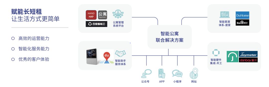 在这些行业解决方案的基础上,汉得融入了百度智能云专业的IoT技术支持,如智能家居体系、智能客服服务体系、智能硬件集成等能力,并推出了全面智能的汉得智能公寓联合解决方案,使其具备了更高效的运营能力、更智能化的服务能力,更优秀的客户体验。