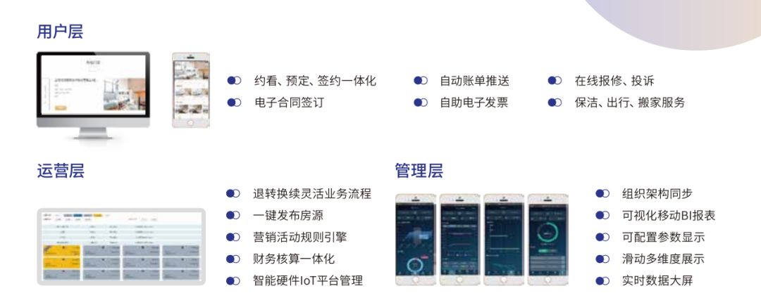 “汉得面向用户端,提供APP、公众号、小程序以及网站等各类移动端应用,在运营管理系统中,实现房源、合同、签约等全面管理;面向企业端,提供运营管理后台中的内部管理、财务管理,实现业财一体化,包括供应链体系等都推出了全面的解决方案。”