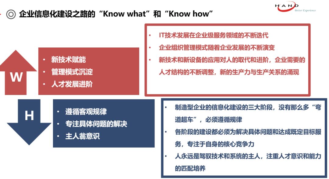 之后她分享了企业信息化建设的规律,从自身经验和积累出发,提炼出企业信息化建设的两点准则:“WHY-为何要信息化”和“HOW-如何建设信息化”。为何要建设信息化,陆嫕颖对此提出三点理由:一是新技术不断涌现,比如IoT、大数据、影像技术的进步都会对我们的工作方式提供革命性变化的可能;二是企业组织的不断革新会对IT的应用提出要求;三是新技术和新设备会对人提出更高的要求。
