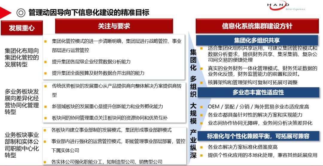 最后,陆嫕颖女士分享了集团化企业应该在信息化建设上关注的重点领域和重点方向,指出在集团层、事业部层和公司层不同层面如何关注自身的核心竞争力,以及如何通过信息化进行赋能。