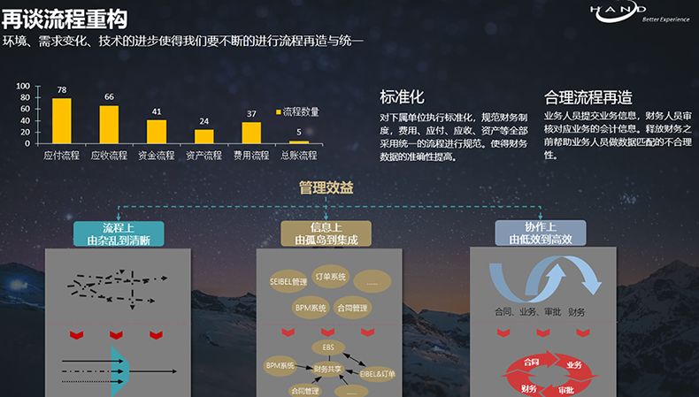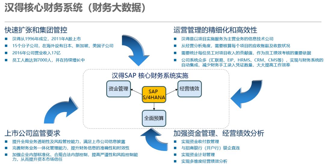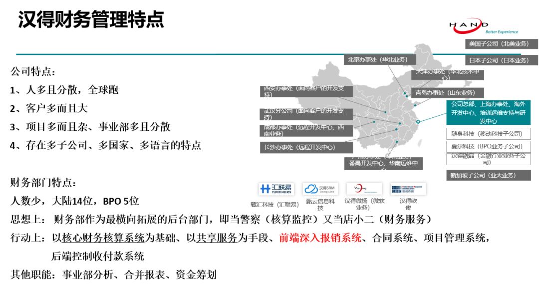 在活动现场他分享道,作为一家咨询服务公司,汉得信息自身就具有财务管理的特点和难点,具有项目管理中人员众多、全球分散等跨国公司的典型特点。“为了应对以上挑战,汉得财务部作为横向拓展范围最广的后台部门,需要既当店小二(财务服务),又要当警察(财务核算)。”
