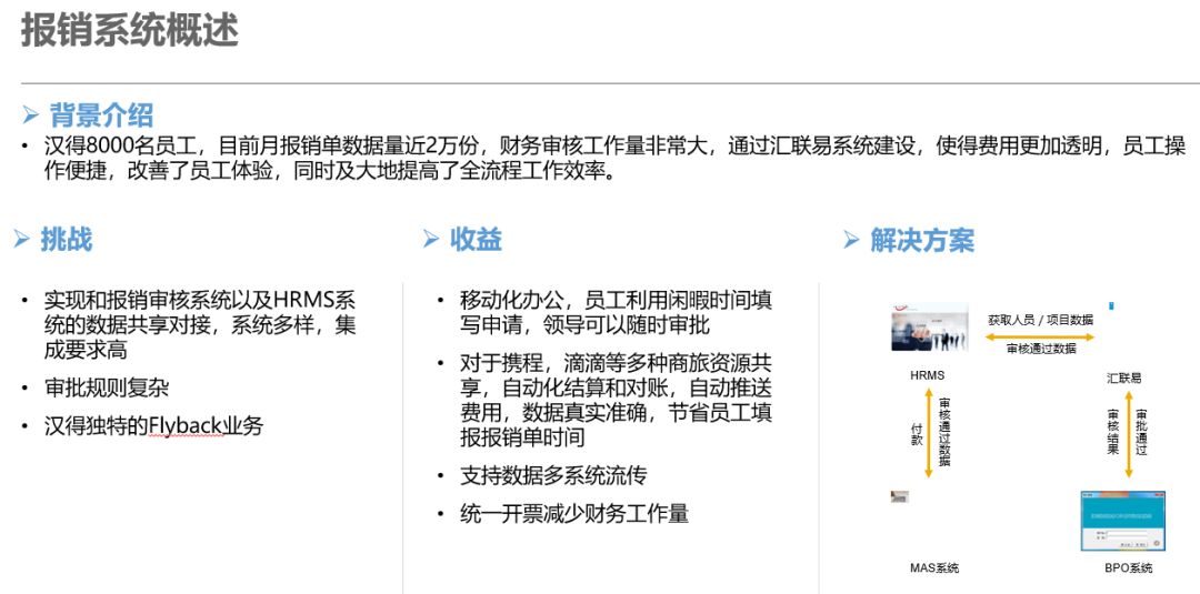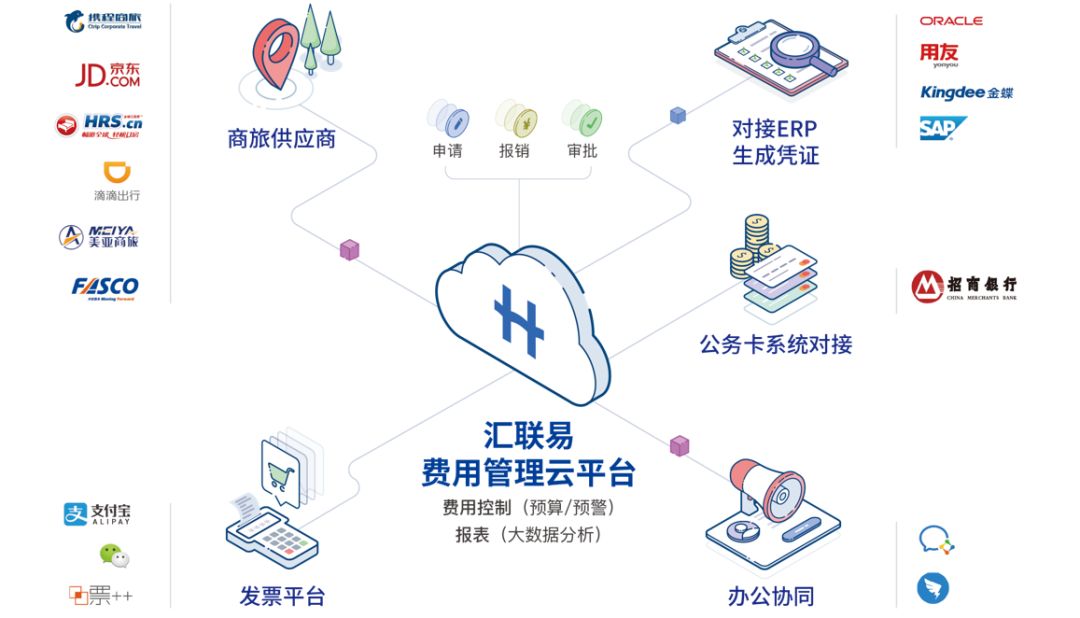 汉得信息内部孵化的SaaS产品汇联易,能够通过机票预测与审批、多元化报销、审批标准的内置、发票验真及自动审核等人性化的功能设计,满足使用者及管理者的要求;并且在与外部系统的打通上,包括商旅供应商、发票供应商、办公供应商及ERP系统都做了标准化的内置,解决了平台型连通的问题。