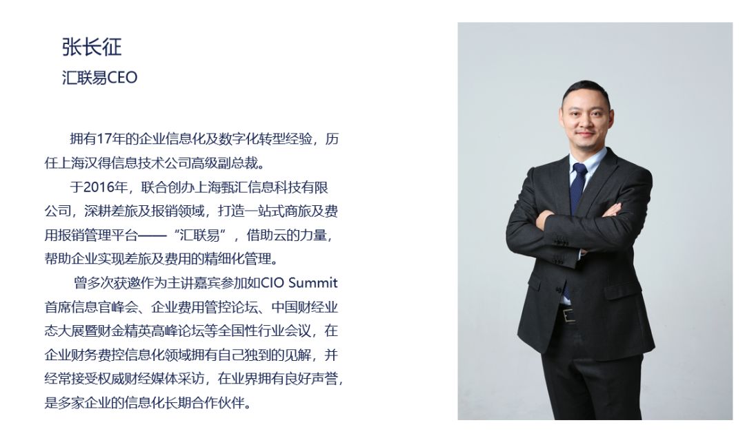 上文已经提到,如何管理报销,如何为员工和企业都提供便利,需要信息化技术的支撑。而汉得信息所使用的费用报销信息化工具就是汇联易。交流现场,汇联易CEO张长征先生为我们分享了费用管理的数字化转型之路。