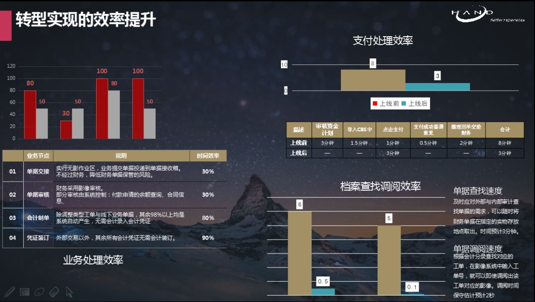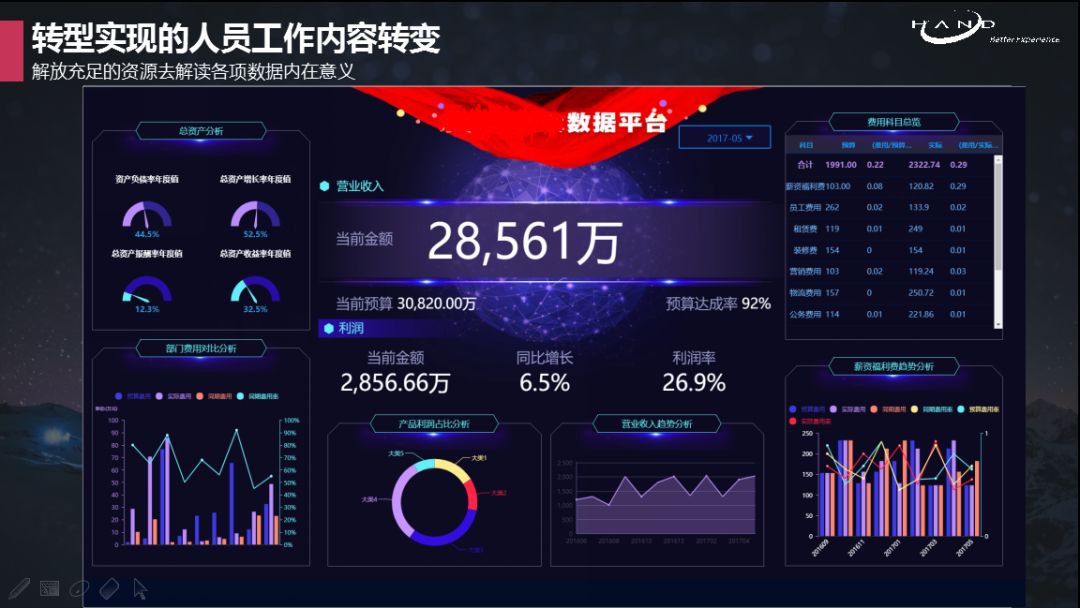 “运行一年半之后,发现整个财务凭证行有404万行,项目数量有2.5万个。以报销为例,汉得10000名员工,目前月报销单数据量3万份,如何进行更细化的财务审核是一个重要的问题。对于如何更好地管理报销,汉得信息目前也提供了更好的处理手段。”通过一系列的改进,汉得信息节约人力成本50%,将能够通过信息化工具处理的业务尽可能简单化。