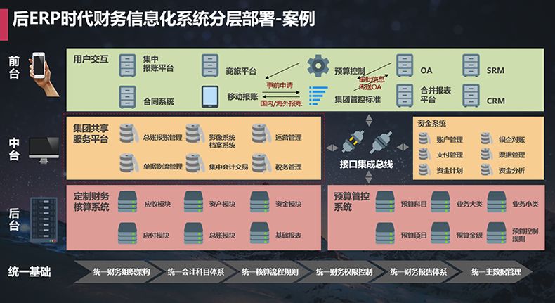 除了分享财务共享的框架、职责及流程优化,李雪松先生还分享了他对于企业信息化架构的思考:在后ERP时代,前台、中台和后台这样三层的架构一定会成为一种潮流。不断的新技术、新场景都会补充到整体的应用中来。企业要抱着开放、互联的态度拥抱IT技术的新变化。