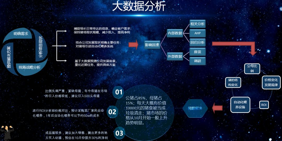 在切入这个话题前,李剑先生首先分享了一个猪场业务经营的例子,比较了传统的数据分析与大数据分析的差异,进而给出结论:大数据作为一种生产力,是能够为企业的经营决策提供依据的。
