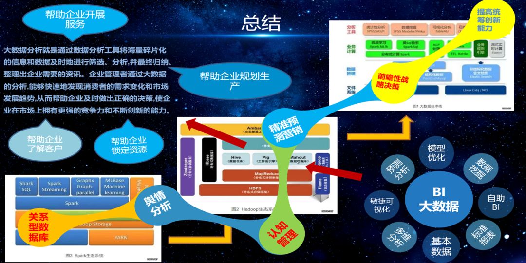 在介绍了整个大数据的应用场景之后,李剑先生重新总结了大数据分析的定义及适用的场景,包括舆情分析、认知管理、精准营销、前瞻性决策及最终提高统筹创新能力。