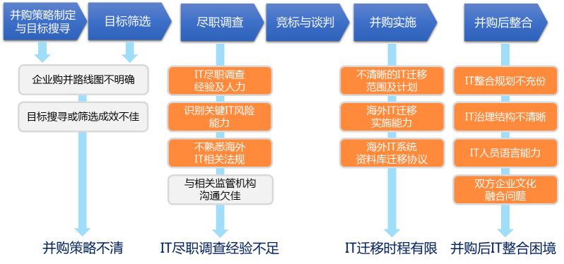 而在企业进行海外并购前期,公司IT部门则可能会面临并购策略不清、IT尽职调查经验不足、IT迁移时程有限及并购后IT整和困境等多方面尽职调查挑战:
