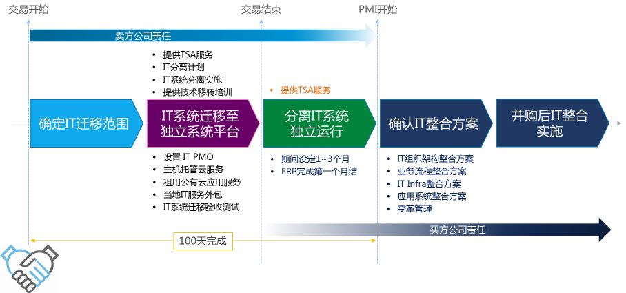在实务中采取签署过渡服务协议(Transition Services Agreements,TSA)的方式,合理地订定在实施并购中/后的一段时间内,如何续用卖方公司原有的IT资源及服务。