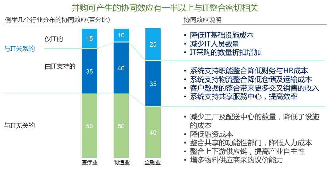 对全球企业众多的并购案例研究发现,在合并后实现的协同效益与IT整合关系密切的占比达到50%~60%: