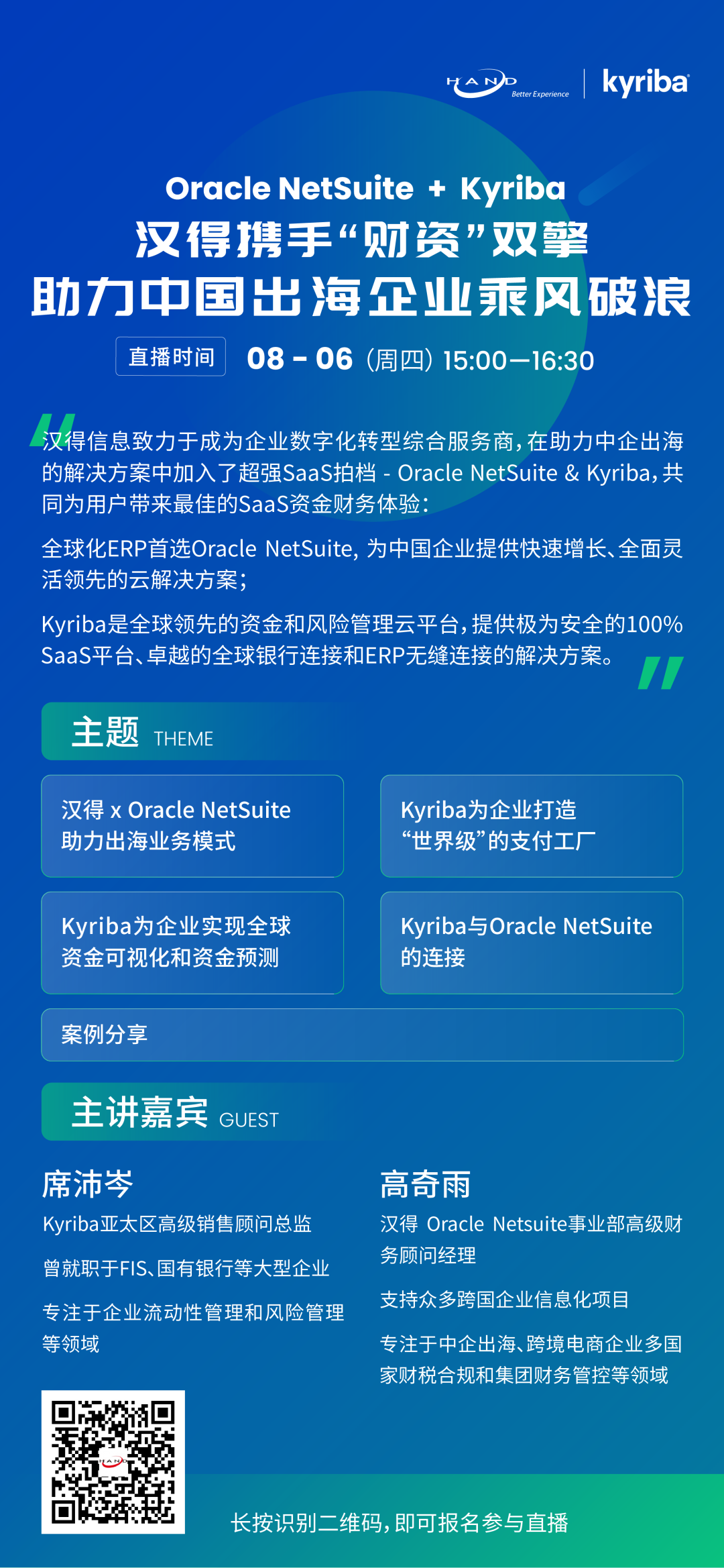 汉得信息凭借5000+客户的行业案例积累、超过20年专注的企业信息化服务经验,结合Oracle NetSuite 灵全快的产品优势,以及先进的Kyriba资金管理平台,助力中企出海与跨境电商客户,在国际业务上更好地进行拓展与管理。