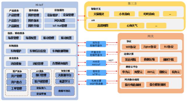 Hi-IoT集成了AWS、Azure、华为云、阿里云四个公有云平台,可依托于多个云端提供的物联网服务来进行数据分析和处理,同时Hi-IoT也支持私有化的部署。目前拥有系统管理、基础信息服务、产品管理、网关管理、设备管理、场景管理等常见功能,并且内置了车联网、智能家居、工业互联、智慧农业等专业化的模块。