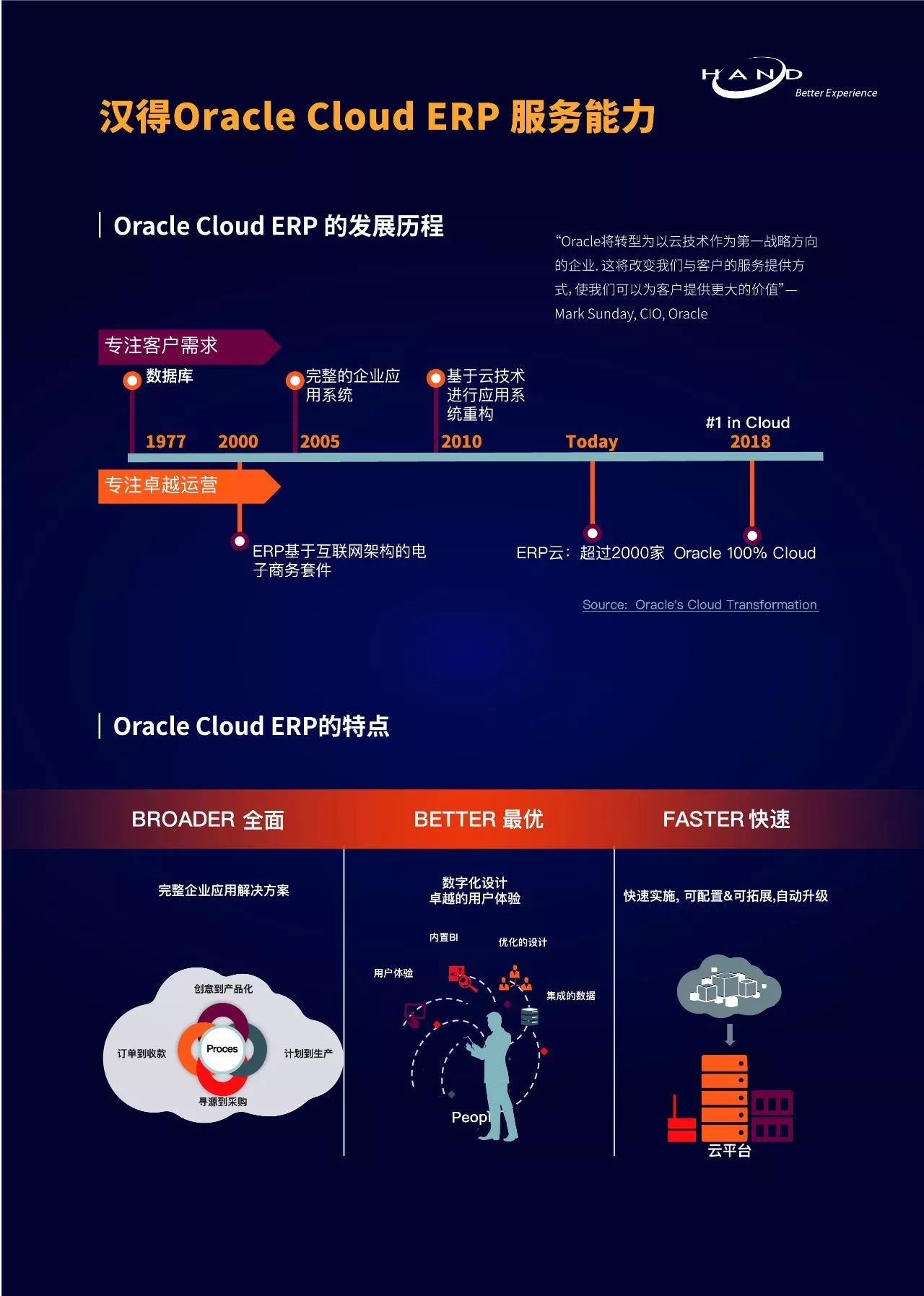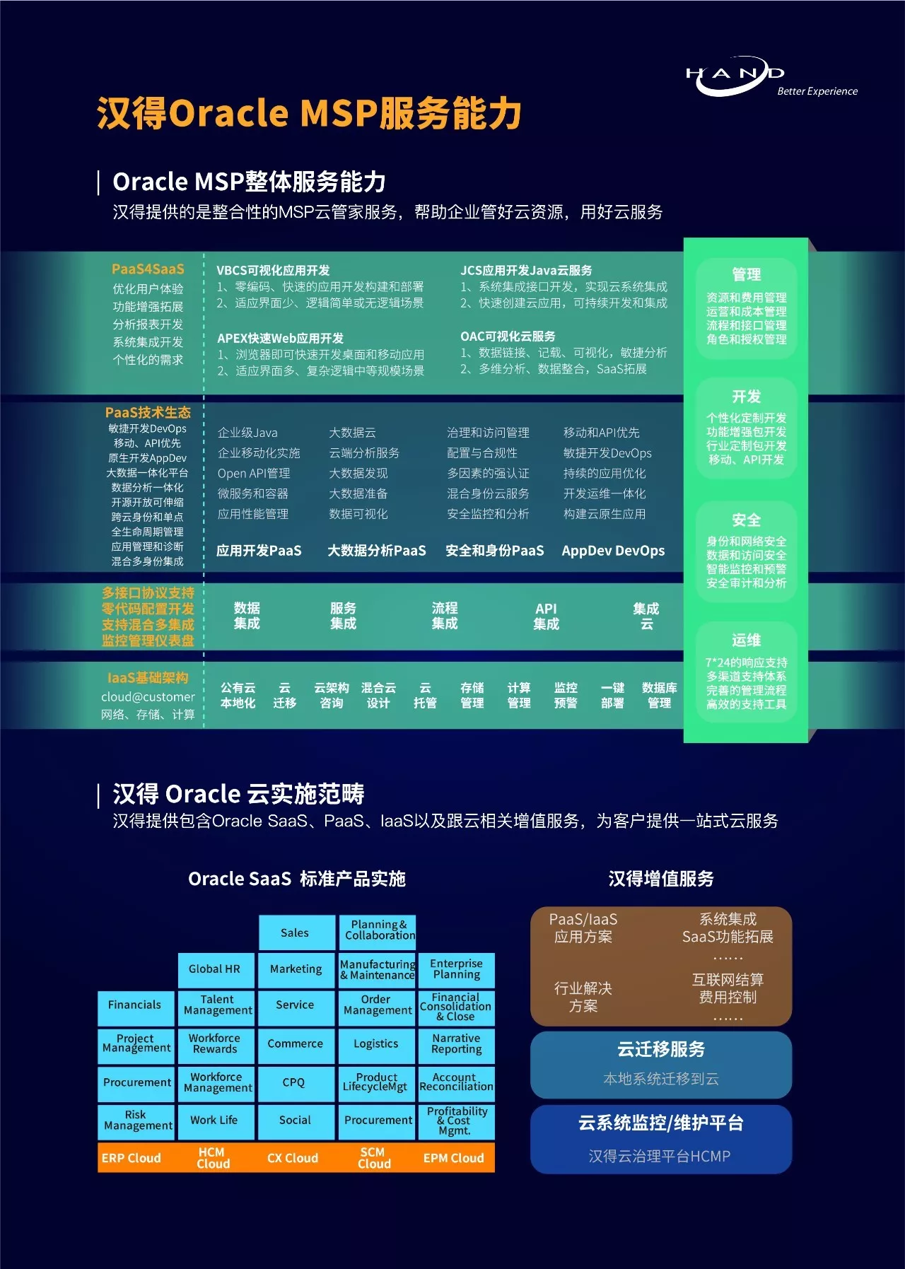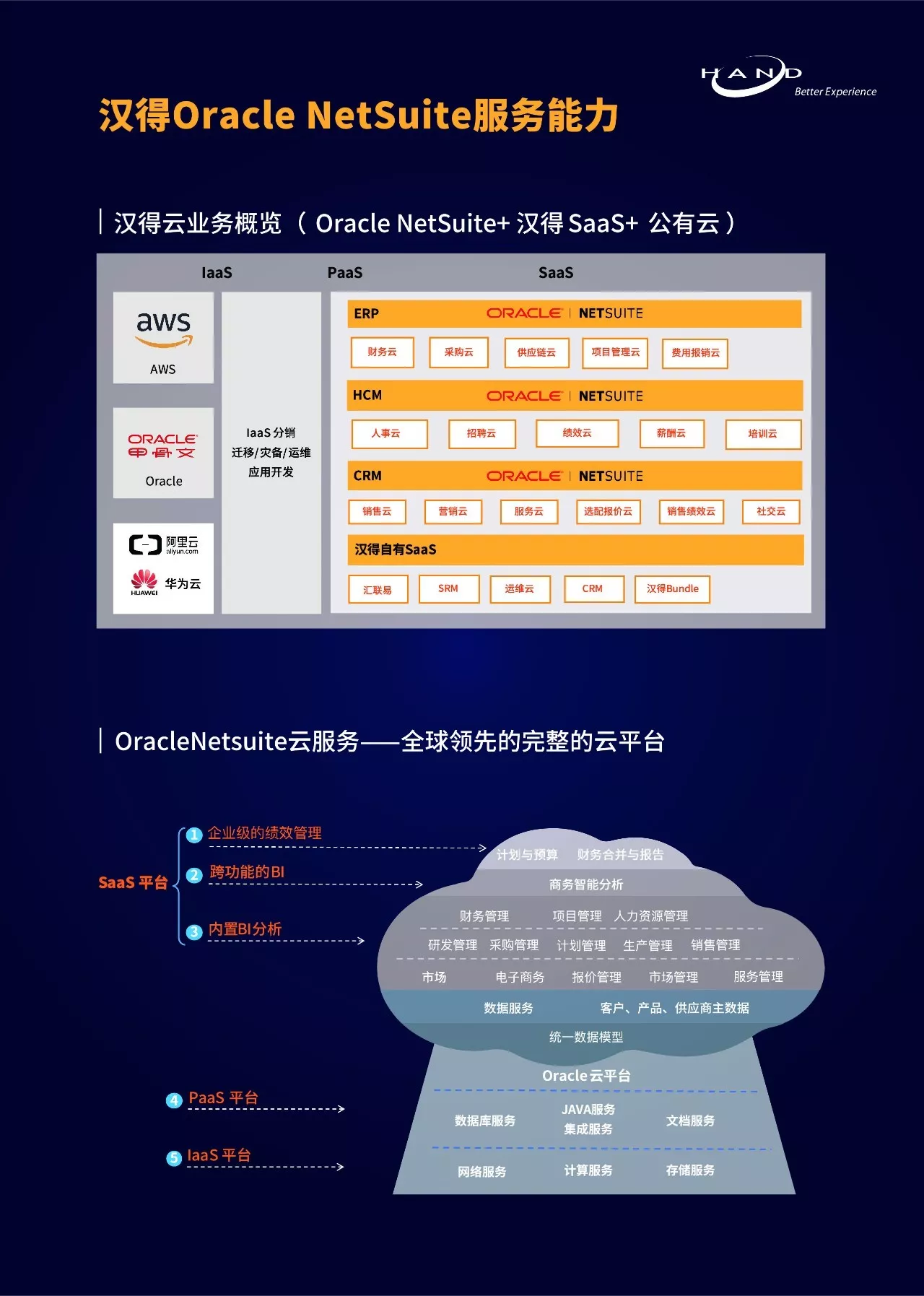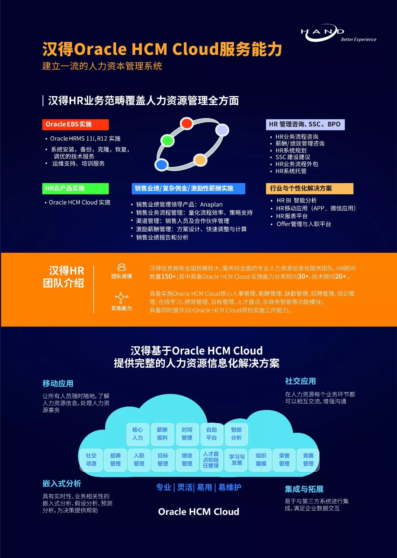 汉得联合Oracle一起,在云技术中创新求发展,为Oracle SaaS、PaaS,组建了国内外专业的销售、售前和交付团队,构建完善的云团队快速响应客户诉求,将立足Oracle NetSuite 云ERP、Oracle HCM云、Oracle CX云等多种云产品帮助企业在云时代迅速创新,自信成长。