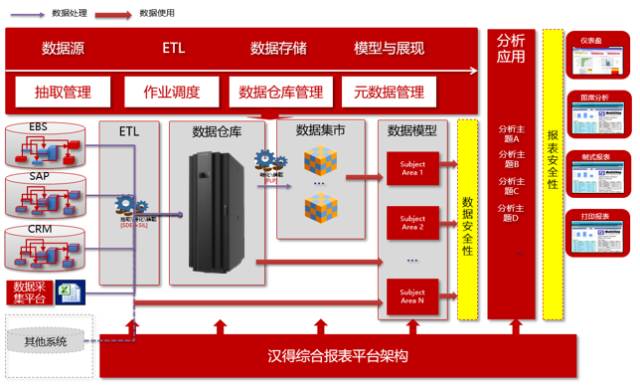 汉得根据多年ERP和数据分析项目实施经验,并结合汉得综合报表平台的功能定位,把企业报表分析应用类型分为四类,即 管理驾驶舱、自助分析、制式报表和打印报表。管理驾驶舱主要是面向中、高层,以汇总型图表为主,为分析、统计、预测等提供参考依据;自助分析主要是面向全体员工,为员工提供根据即时数据需求,查询获取企业数据的接口,无需技术人员参与;制式报表和打印报表主要是面向业务操作人员,以查询固定格式数据为主,为数据分析提供参考。