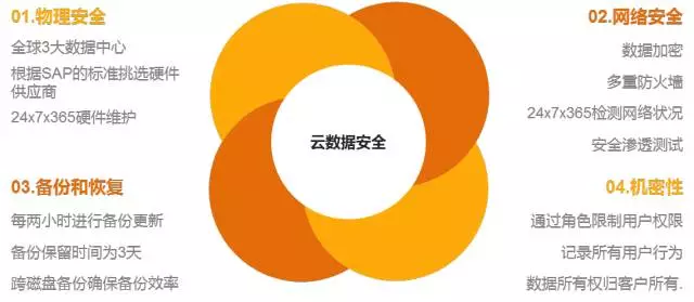 3. 云数据安全保障体系:SAP Hybris C4C以严格标准选择硬件,建设全球四大数据中心,从网络加密、多频次备份、多角色权限控制和全过程操作记录等方面保证客户云端系统数据的安全性和机密性,为客户提供24*7*365全天候的服务。