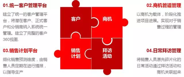 汉得正在为某大型工程机械制造集团和某传动系统制造公司等高端制造业客户实施SAP Hybris C4C系统,为其打造打通售前-售中-售后的客户关系管理平台,规范企业内部业务流程,提升其客户满意度。