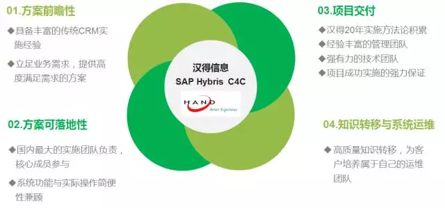 汉得SAP Hybris C4C团队一直秉承着以客户良好体验为目标的宗旨,是目前中国规模领先的SAP CRM & SAP Hybris C4C实施团队,能够为客户提供具有行业前瞻性、可落地性方案,配备经验丰富的管理团队、保证项目交付质量,具备完善的知识转移和系统运维体系,为广大的中小企业客户提供全方位、一站式的实施服务,为项目成功实施保驾护航。