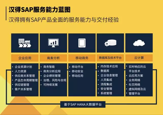 汉得信息自1997年成为SAP在中国的认证合作伙伴以来,紧随时代动向,通过20多年的努力,汉得已由以ERP实施为主的服务领域扩展为横向涵盖全面的企业信息化产品、纵向涵盖从咨询规划到实施交付再到长期运维的信息化全生命周期服务。一方面我们在产品交付上不断更新,与IT发展潮流及厂商产品展同步;一方面不断深化对客户行业业务的理解,打造更深入更完整的解决方案。