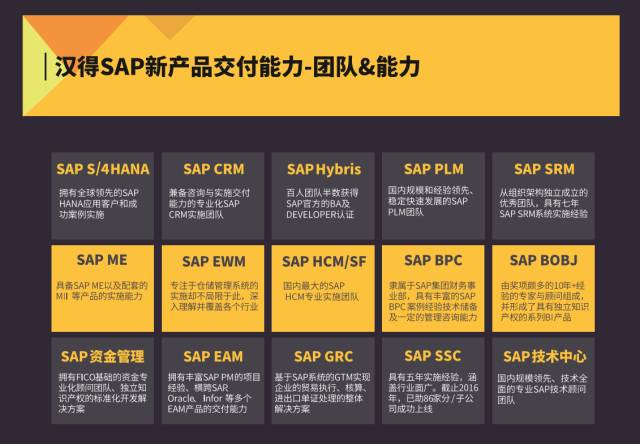 汉得信息自1997年成为SAP在中国的认证合作伙伴以来,成功地为近千家中外企业实施部署了SAP 产品。我们的客户覆盖大型装备制造、机械制造、高科技、家用电器、化工、医药、汽车配件、快速消费品等行业。 ——2007年,SAP授予汉得信息支持中心SAP VAR支持中心认证,是中国本土第一家获得此资格认证的咨询公司。 ——2009年,成为SAP金牌合作伙伴,2016年成为SAP白金合作伙伴; ——2010年,汉得信息荣获“SAP亚太TOP合作伙伴”称号。 ——2014年,公司的SAP实施获得了ISO9000质量和信息安全认证,也获得了SAP HANA( All in One) 的方案认证,成为SAP官方推荐的HANA方案实施商。 ——2014-2016连续三年获得SAP Hybris亚太区大奖 ——大中国地区首批获得S/4HANA认证的公司 ——多次荣获“SAP最佳合作伙伴“称号。