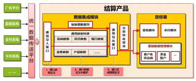 1.数据集成:通过在通用接口平台自主定义各业务表结构及数据导入规则,获取各类业务数据,转化为结算系统数据,使日处理量可达数百万单。
