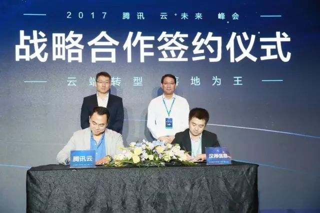 本次战略合作签约仪式腾讯云总裁邱跃鹏先生,腾讯云副总裁谢岳峰先生、汉得信息CEO黄益全先生、汉得信息CRM事业部总经理杨维成先生共同出席了会议。