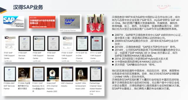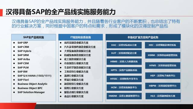 汉得拥有亚太地区规模领先的专职SAP实施顾问资源池,提供丰富的SAP应用及技术产品交付能力。