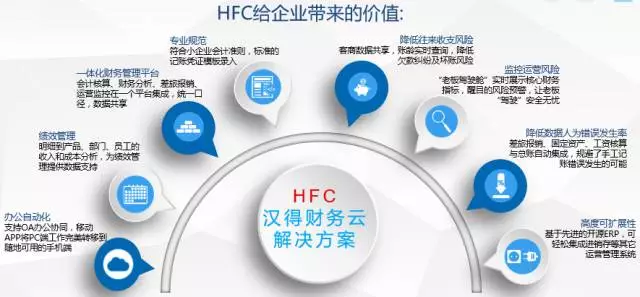 HFC汉得财务云ERP系统是基于云平台的轻量级财务管理系统,服务于快速成长期的中小企业。解决中小企业不同岗位、不同层次人员的使用需求,帮助企业规范核算标准、提高工作效率、减少人力成本浪费。