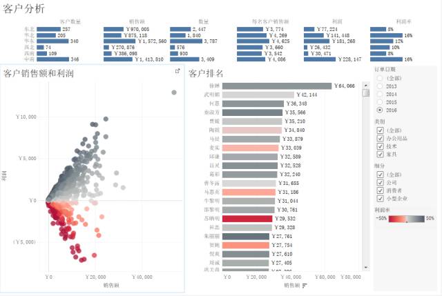 秉着人人都是数据分析师的方针,Tableau以极简且美观的界面风格为用户带来最流畅的操作体验,拖拽即可成形,且仪表盘中的各种图表都具有完全的交互性,引导探索数据的未知和可知。