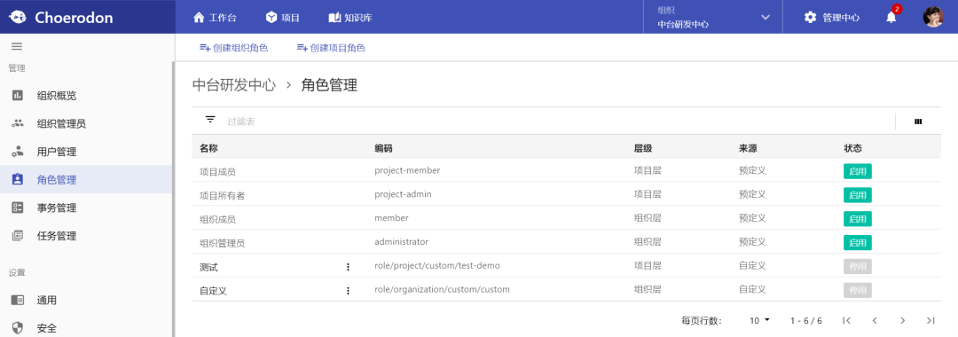 组织层“管理中心”新增“角色管理”的功能,支持组织管理员在此创建组织层或项目层的自定义角色;