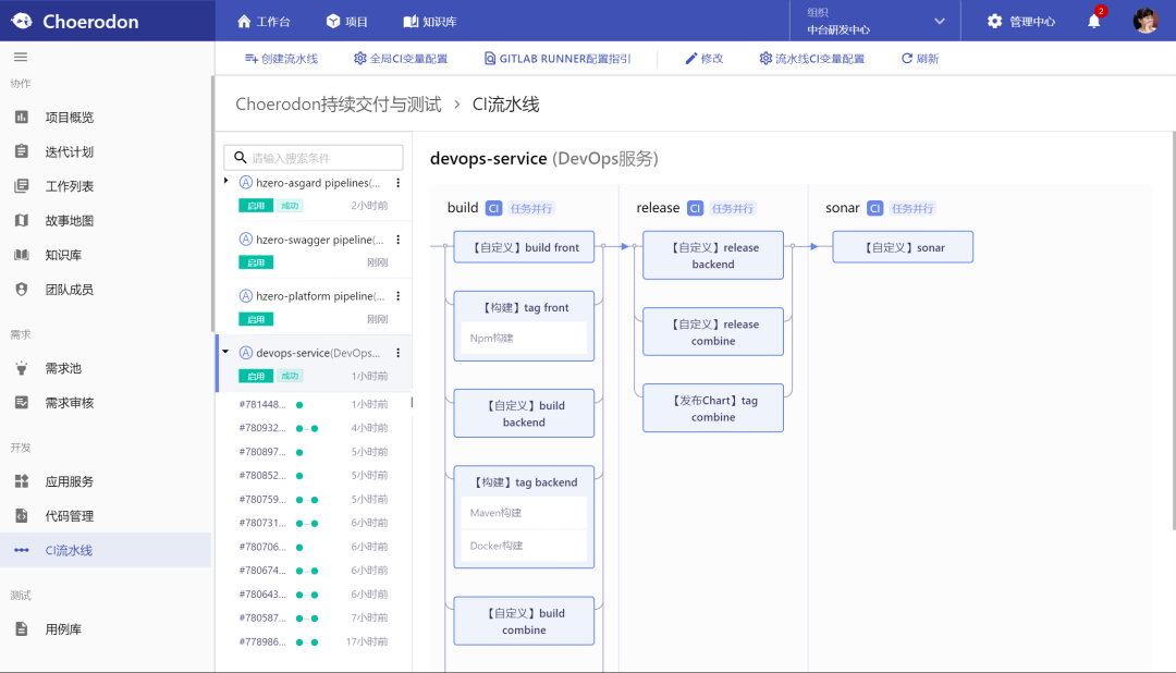 开发模块新增“CI流水线”的功能,支持创建多个阶段,且每个阶段中可添加多个任务;
